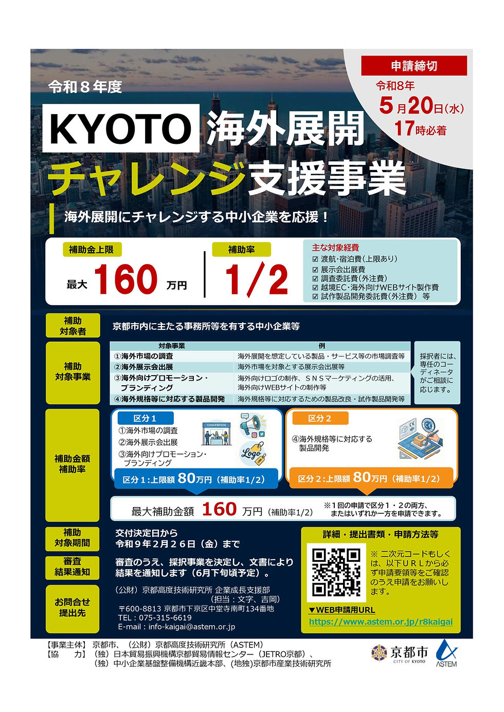 【ASTEM】「海外展開事業補助金最大160万円! KYOTO海外展開チャレンジ支援事業 募集」のお知らせ
